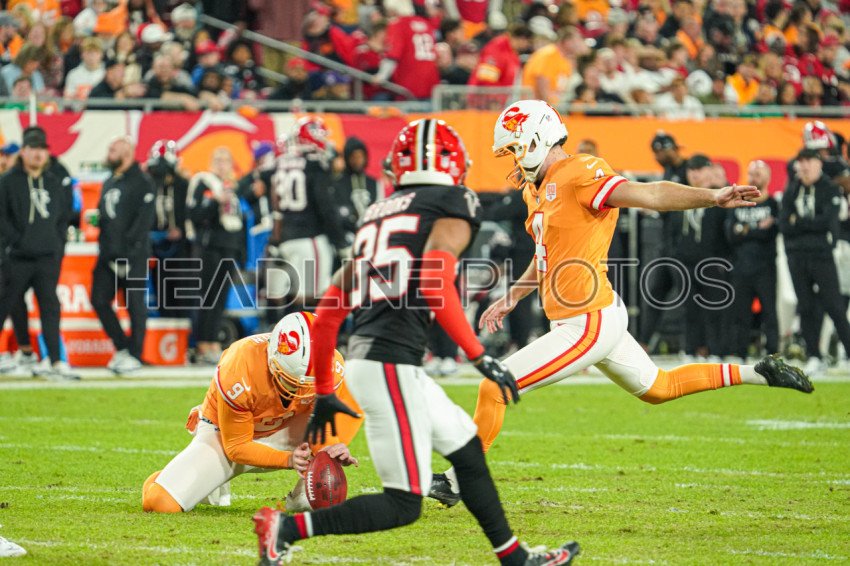 Tampa Bay, Florida, USA, December 11, 2025, Tampa Bay Buccaneers kicker Chase McLaughlin #4 makes a kick at Raymond James Stadium. (Photo Credit: Marty Jean-Louis)