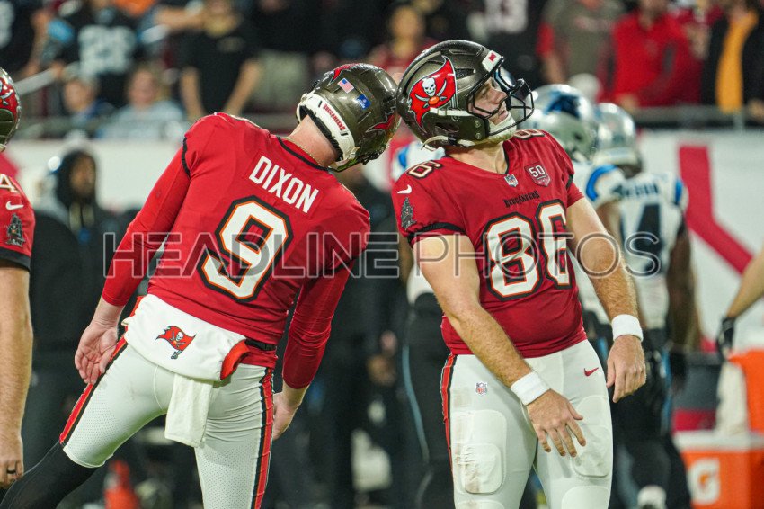 Tampa Bay, Florida, USA, January 3, 2026, Tampa Bay Buccaneers players Riley Dixon #9 and Evan Deckers #86 celebrate a play at Raymond James Stadium. (Photo Credit: Marty Jean-Louis)