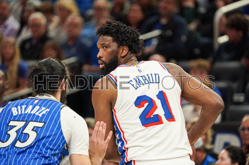 Orlando, Florida, USA, January 9, 2026, Philadelphia 76ers player Joel Embiid #21 guarding the ball against Goga Bitadze #35 at the Kia Center. (Photo Credit: Marty Jean-Louis)