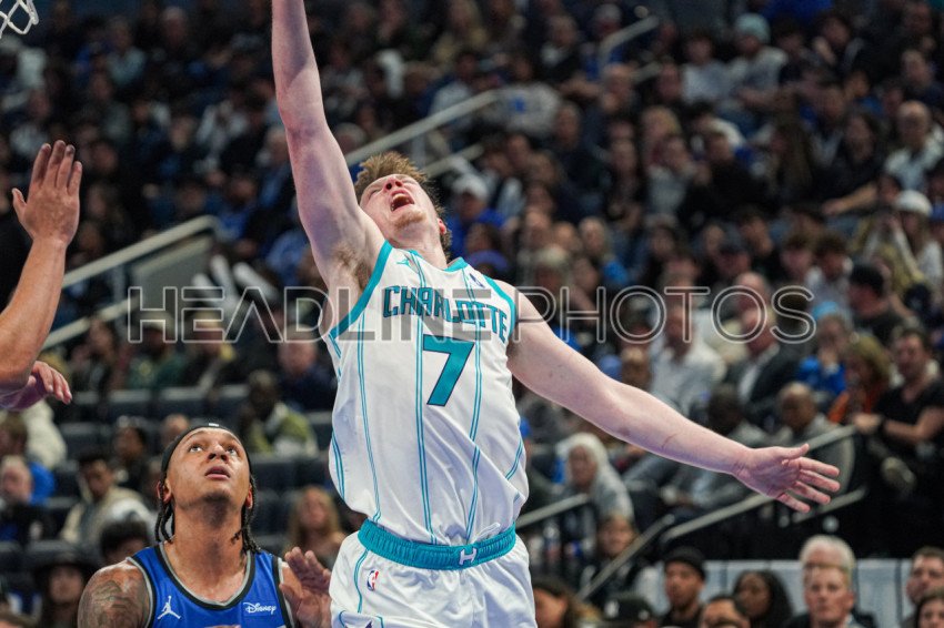 Orlando, Florida, USA, January 23, 2026, Charlotte Hornets forward Kon Knueppel #7 attempt to score at the Kia Center. (Photo Credit: Marty Jean-Louis)