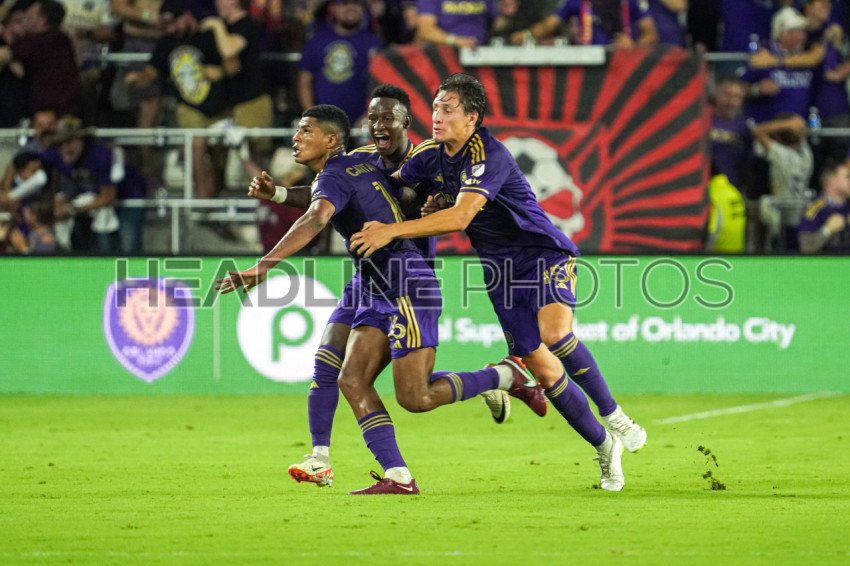 Orlando, Florida, USA, October 30, 2023, Orlando City players celebrate goal at Exploria Stadium (Photo Credit: Marty Jean-Louis)
