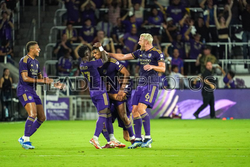 Orlando, Florida, USA, October 30, 2023, Orlando City players celebrate goal at Exploria Stadium (Photo Credit: Marty Jean-Louis)