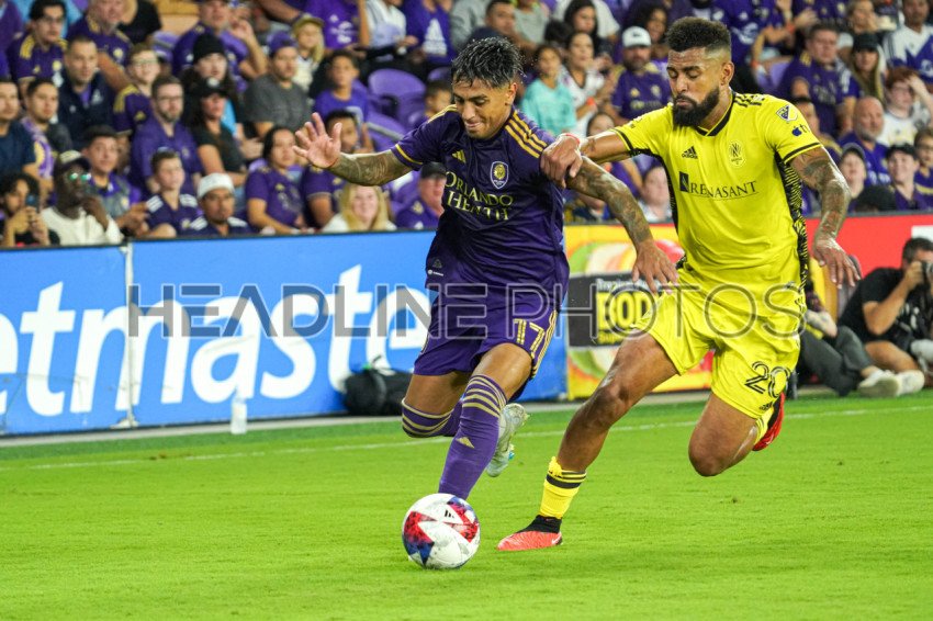 Orlando, Florida, USA, October 30, 2023, Orlando City player Facundo Torres #17 runs forward as he gets pressure from Anibal Godoy #20 at Exploria Stadium (Photo Credit: Marty Jean-Louis)