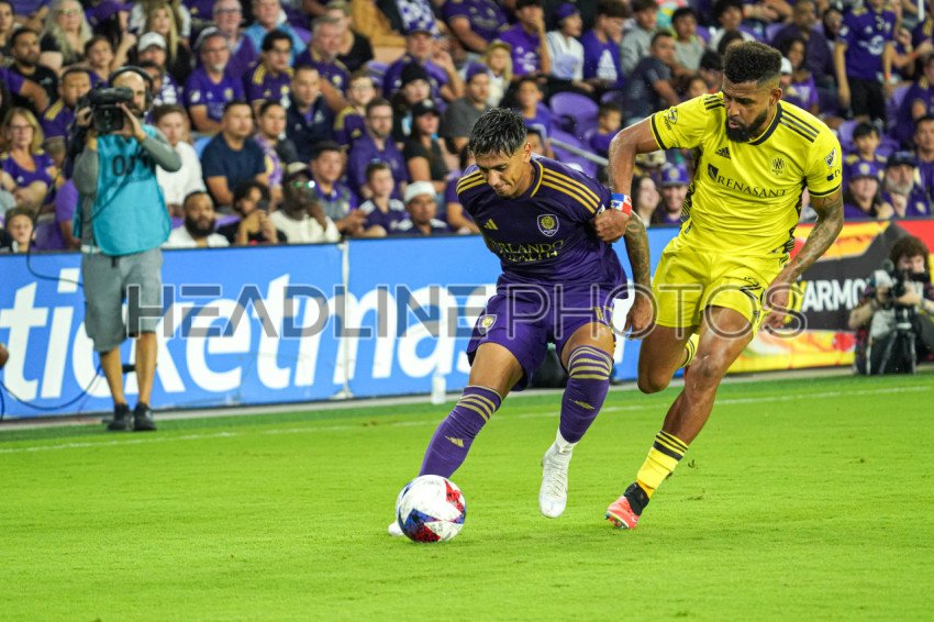 Orlando, Florida, USA, October 30, 2023, Orlando City player Facundo Torres #17 runs forward as he gets pressure from Anibal Godoy #20 at Exploria Stadium (Photo Credit: Marty Jean-Louis)