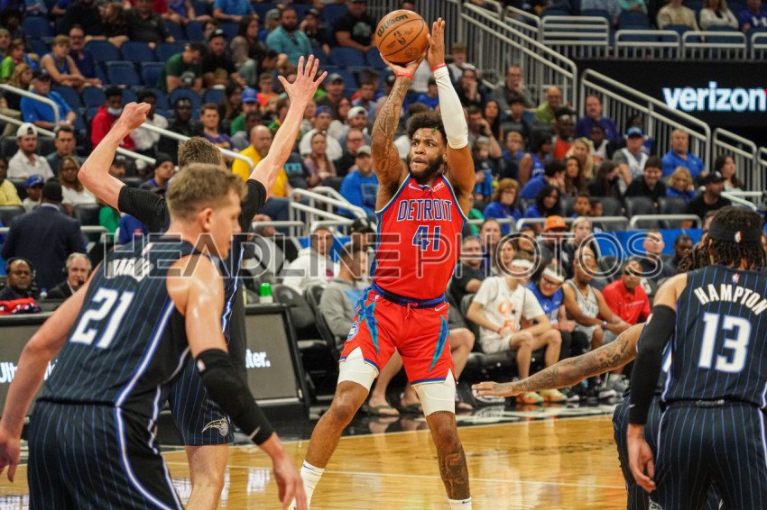 Orlando, Florida, USA, March 17, 2022, Detroit Pistons Small Forward Saddiq Bey #41 takes a three point shot in the first half at the Amway Center. (Photo Credit: Marty Jean-Louis)