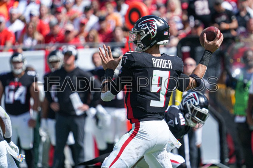 Tampa Bay, Florida, USA, October 22, 2023, Atlanta Falcons quarterback Desmond Ridder #9 looks to make a pass in the first half at Raymond James Stadium. (Photo Credit: Marty Jean-Louis)