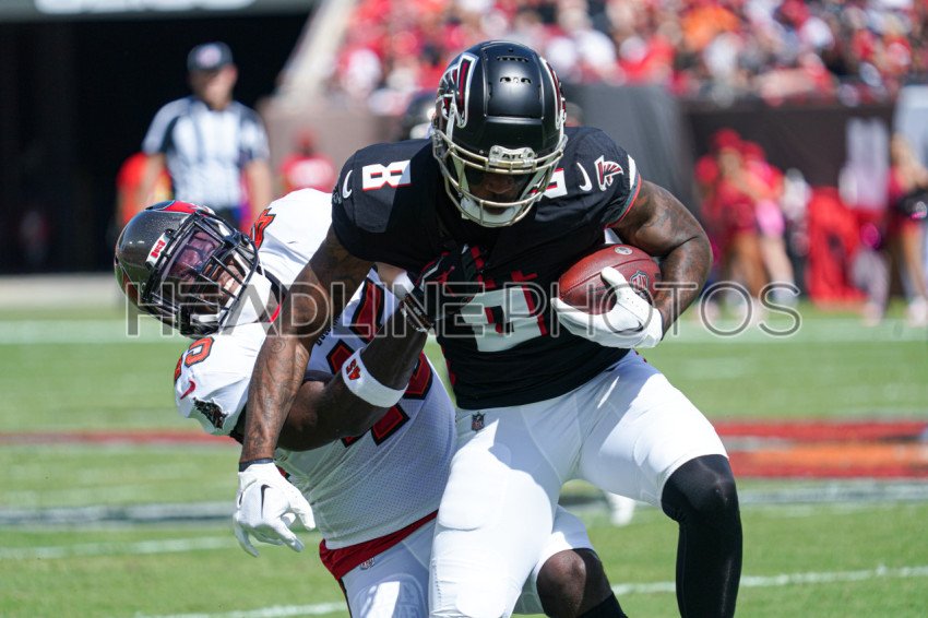 Tampa Bay, Florida, USA, October 22, 2023, Atlanta Falcons Tight End Kye Pitts #8 gets tackled by Devin White #45 at Raymond James Stadium. (Photo Credit: Marty Jean-Louis)