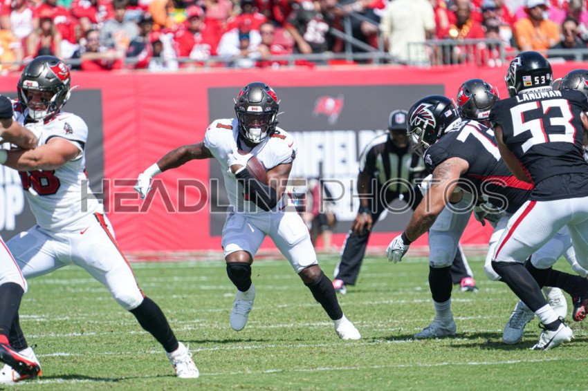 Tampa Bay, Florida, USA, October 22, 2023, Tampa Bay Buccaneers running back Rachaad White #1 makes a run at Raymond James Stadium. (Photo Credit: Marty Jean-Louis)