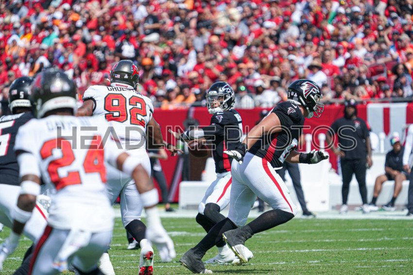 Tampa Bay, Florida, USA, October 22, 2023, Atlanta Falcons quarterback Desmond Ridder #9 makes a pass during the first half at Raymond James Stadium. (Photo Credit: Marty Jean-Louis)