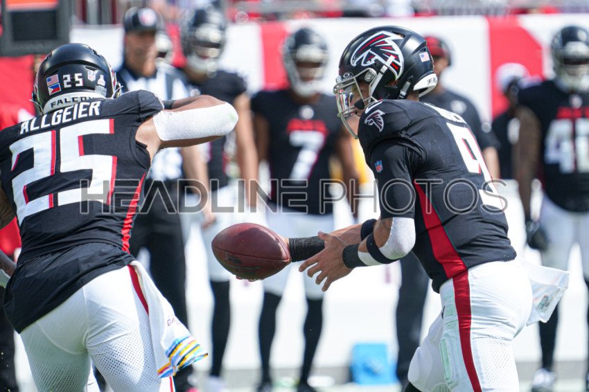 Tampa Bay, Florida, USA, October 22, 2023, Atlanta Falcons quarterback Desmond Ridder #9 makes a pass to Tyler Allgeier #25 at Raymond James Stadium. (Photo Credit: Marty Jean-Louis)