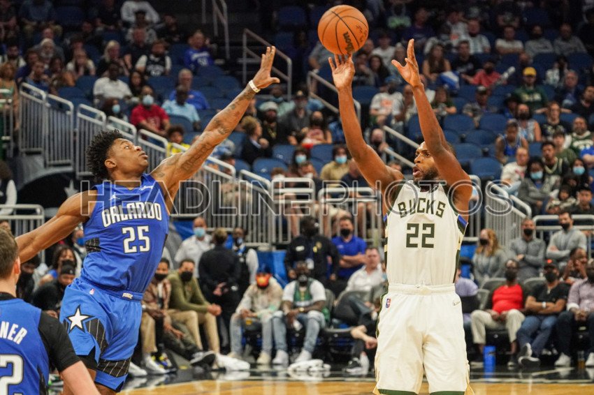 Orlando, Florida, USA, December 30, 2021, Milwaukee Bucks forward Khris Middleton #22 shoots a three point at the Amway Center. (Photo Credit: Marty Jean-Louis)