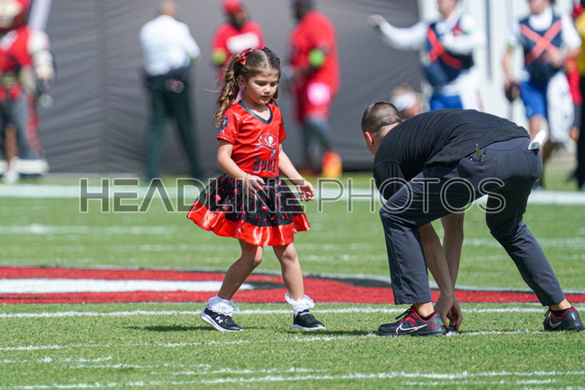 Tampa Bay, Florida, USA, October 22, 2023, Little girl runs on the field before the Atlanta Falcons vs Tampa Bay Buccaneers game at Raymond James Stadium. (Photo Credit: Marty Jean-Louis)