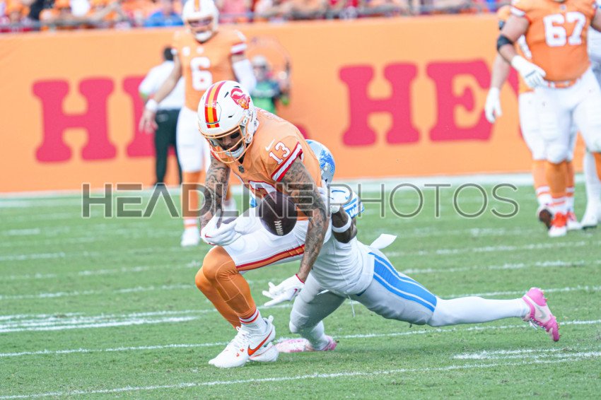 Tampa Bay, Florida, USA, October 15, 2023, Tampa Bay Buccaneers player Mike Evans #13 loses control of the ball during the first half at Raymond James Stadium. (Photo Credit: Marty Jean-Louis)
