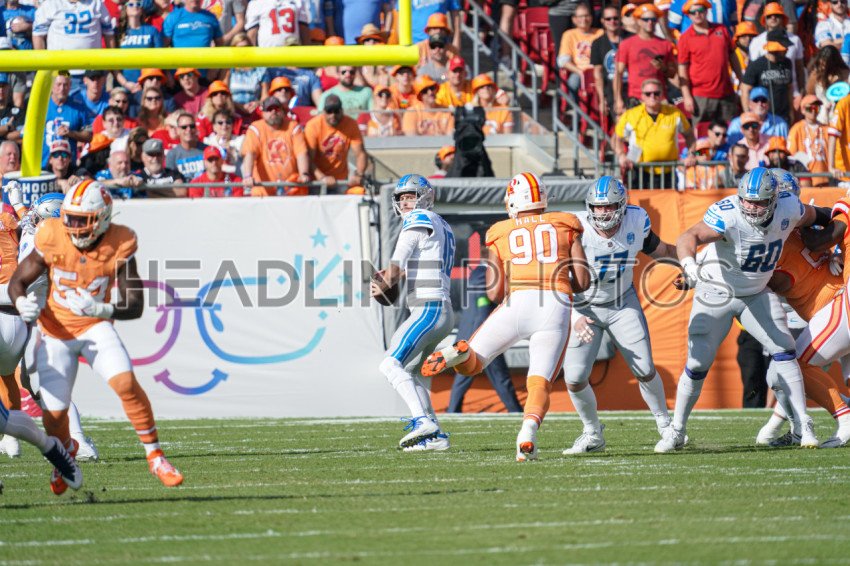 Tampa Bay, Florida, USA, October 15, 2023, Detroit Lions quarterback Jared Goff #16 look to make a pass at Raymond James Stadium. (Photo Credit: Marty Jean-Louis)
