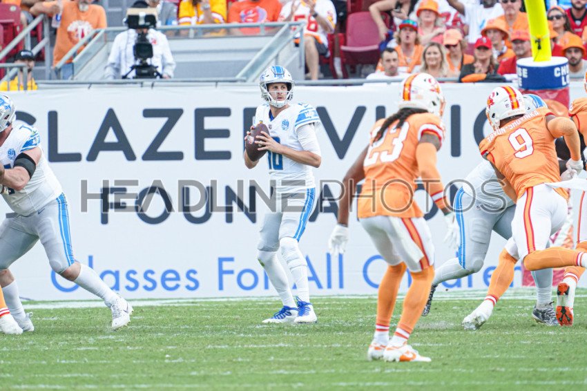 Tampa Bay, Florida, USA, October 15, 2023, Detroit Lions quarterback Jared Goff #16 look to make a pass at Raymond James Stadium. (Photo Credit: Marty Jean-Louis)