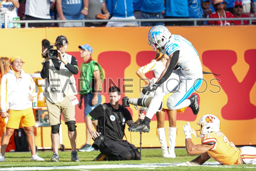 Tampa Bay, Florida, USA, October 15, 2023, Detroit Lions Wide Receiver Amon-Ra St. Brown #14 leaps to avoid tackle at Raymond James Stadium. (Photo Credit: Marty Jean-Louis)