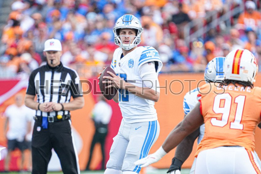 Tampa Bay, Florida, USA, October 15, 2023, Detroit Lions quarterback Jared Goff #16 look to make a pass at Raymond James Stadium. (Photo Credit: Marty Jean-Louis)