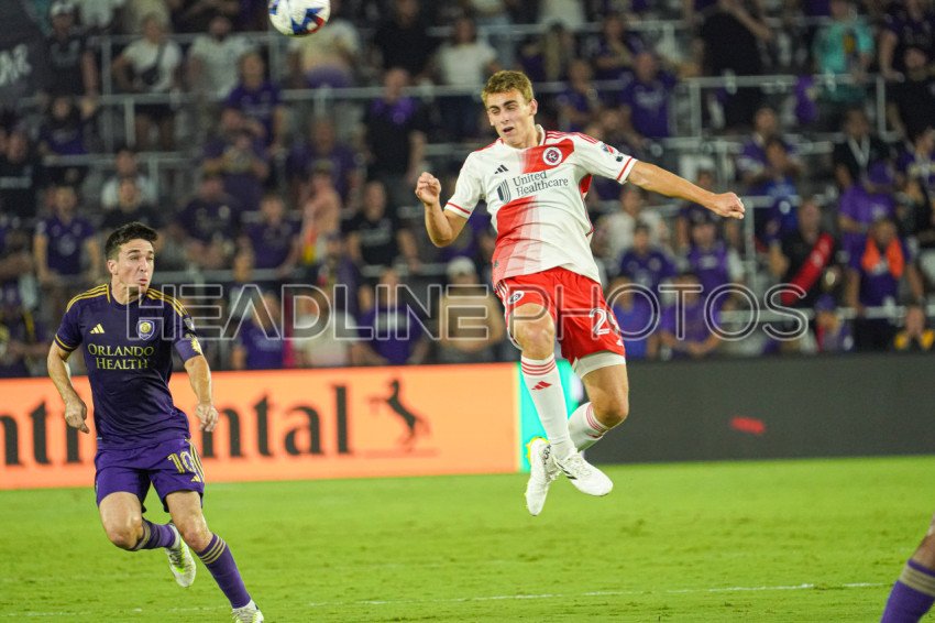 Orlando, Florida, USA, October 7, 2023, New England Revolution player Noel Buck #29 makes a header in the first half at Exploria Stadium. (Photo Credit: Marty Jean-Louis)