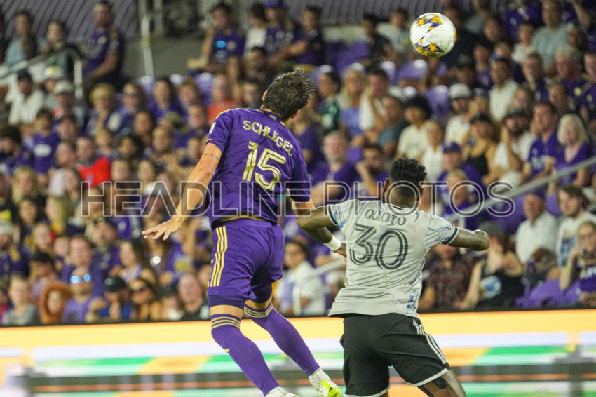 Orlando, Florida, USA, September 30, 2023, Orlando City SC defender Rodrigo Schlegel #15 wins the header at Exploria Stadium. (Photo Credit: Marty Jean-Louis)