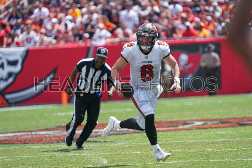 Tampa Bay, Florida, USA, September 17, 2023, Tampa Bay Buccaneers quarterback Baker Mayfield #6 is on the run at Raymond James Stadium. (Photo Credit: Marty Jean-Louis)
