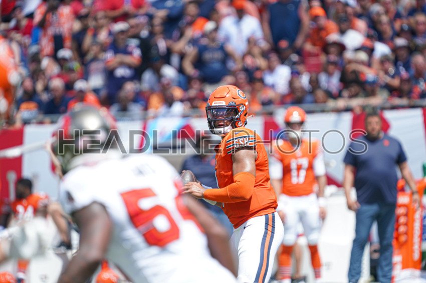 Tampa Bay, Florida, USA, September 17, 2023, Chicago Bears quarterback Justin Fields #1 looks to make a pass at Raymond James Stadium. (Photo Credit: Marty Jean-Louis)