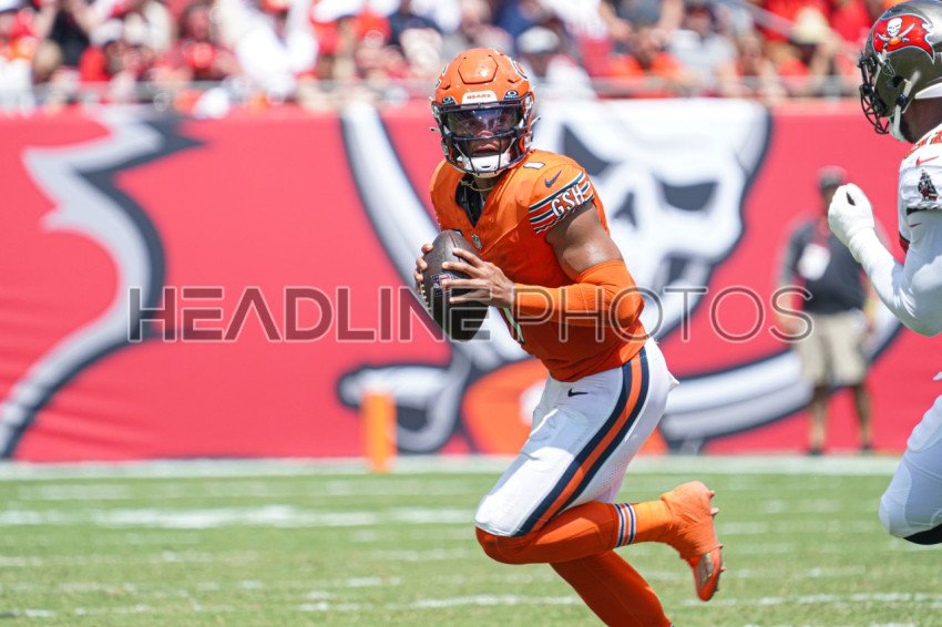 Tampa Bay, Florida, USA, September 17, 2023, Chicago Bears quarterback Justin Fields #1 looks to make a pass at Raymond James Stadium. (Photo Credit: Marty Jean-Louis)