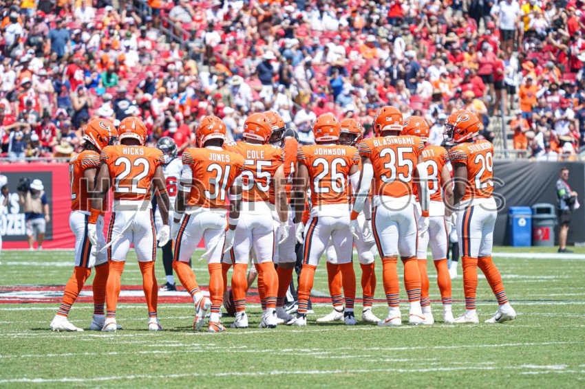 Tampa Bay, Florida, USA, September 17, 2023, Chicago Bears face players hudle before the start of the game at Raymond James Stadium. (Photo Credit: Marty Jean-Louis)