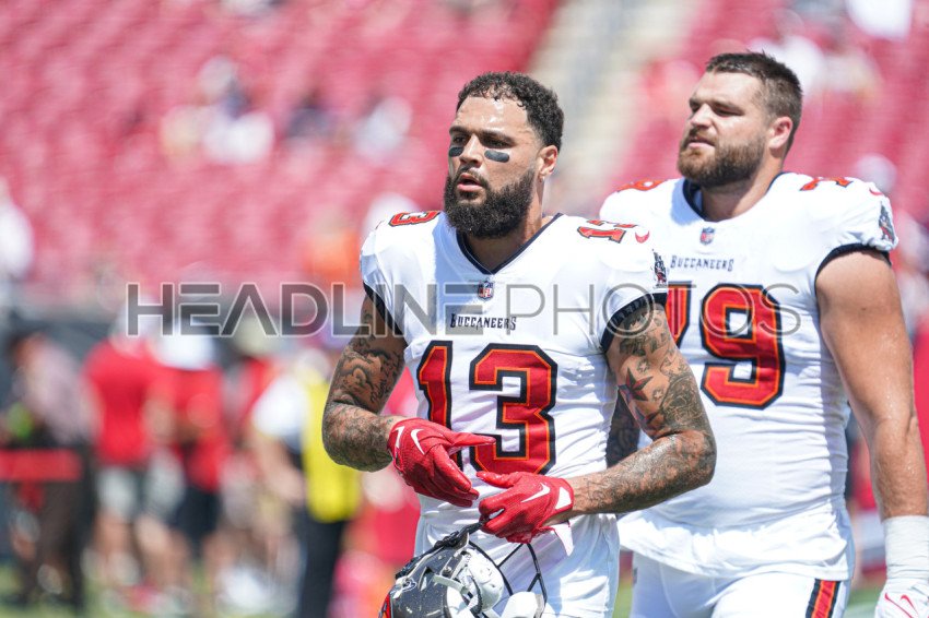 Tampa Bay, Florida, USA, September 17, 2023, Tampa Bay Buccaneers player Mike Evans #13 (front) heading to the locker after warming up at Raymond James Stadium. (Photo Credit: Marty Jean-Louis)