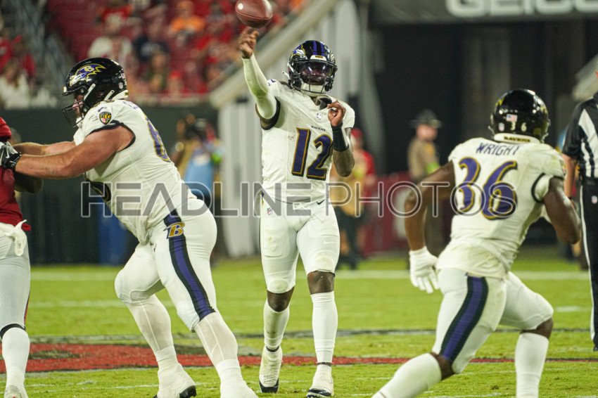Tampa Bay, Florida, USA, August 26, 2023, Baltimore Ravens quarterback Anthony Brown #12 makes a pass at Raymond James Stadium. (Photo Credit: Marty Jean-Louis)