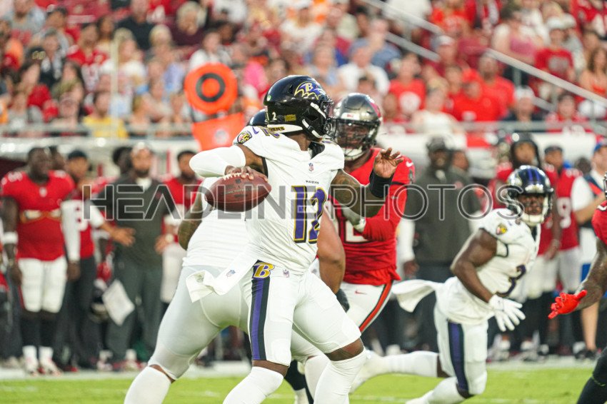 Tampa Bay, Florida, USA, August 26, 2023, Baltimore Ravens quarterback Anthony Brown #12 makes a pass at Raymond James Stadium. (Photo Credit: Marty Jean-Louis)