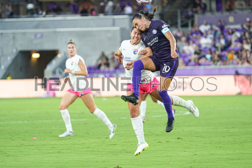 Orlando, Florida, USA, August 25, 2023, San Diego Wave player Danielle Colaprico #24 and Orlando Pride player Marta #3 fight for the header at Exploria Stadium. (Photo Credit: Marty Jean-Louis)