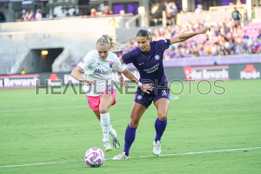 Orlando, Florida, USA, August 25, 2023, San Diego Wave and Orlando Pride players Rachel Hill #3 and Kylie Strom #3 fight for the ball at Exploria Stadium. (Photo Credit: Marty Jean-Louis)