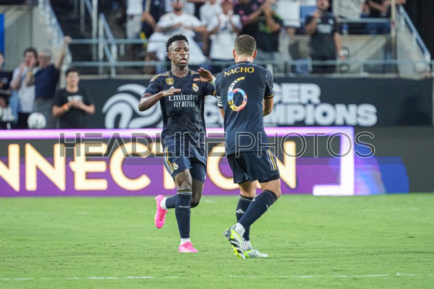 Orlando, Florida, USA, August 1, 2023, Real Madrid players Vini Jr and Nacho celebrate a score during the Soccer Championship Tour Hosted by the Florida Cup at Camping World Stadium . (Photo Credit: Marty Jean-Louis)