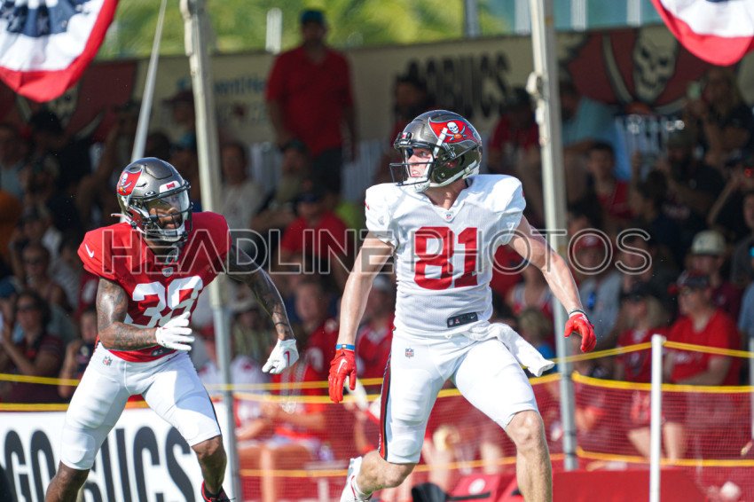 Tampa, Florida, USA, July 31, 2023, Tampa Bay Buccaneers players Derrek Pitts Jr #38 and Ryan Miller #81 during a Training Camp at Advent Health Training Center . (Photo Credit: Marty Jean-Louis)