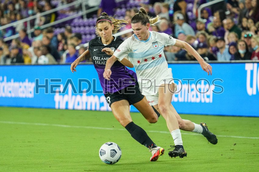 Orlando, Florida, USA, October 29, 2021, Chicago Red Stars player makes a run as Orlando Pride forward Alex Morgan #13 puts pressure at Exploria Stadium. (Photo Credit: Marty Jean-Louis)