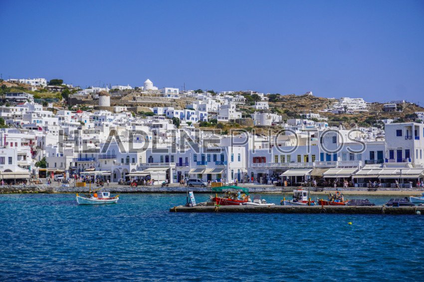 greece greek island mykonos best places in europe blue water boat boating homes mountain painting picturesque summer top places to visit tourists travel vacation water whiteSimilar Photos