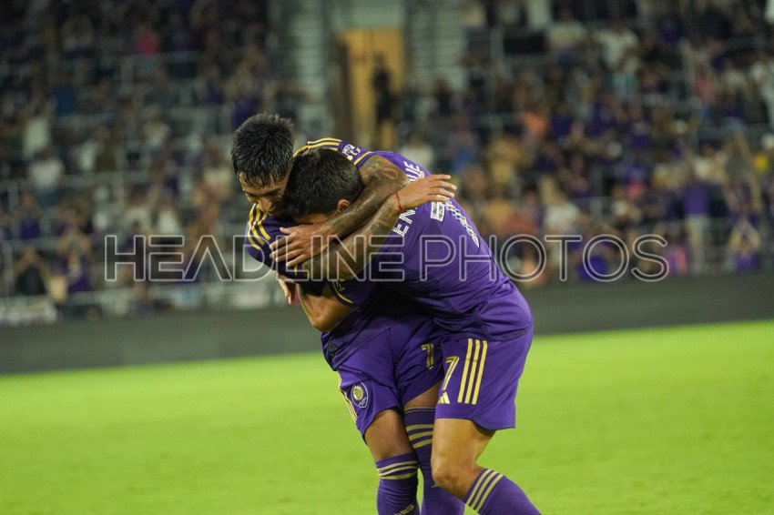 Orlando, Florida, USA, June 10, 2023, face Orlando City SC forward Ramiro Enrique #7 and Facundo Torres #17 share a hug after a goal in the second half at Exploria Stadium. (Photo Credit: Marty Jean-Louis)