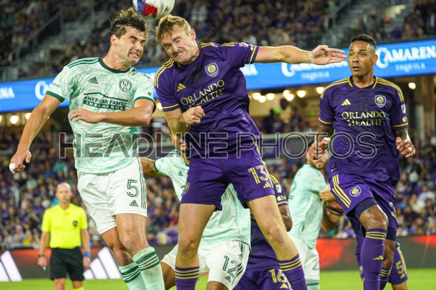 Orlando, Florida, USA, May 27, 2023, Atlanta United player Santiago Sosa #5 and Orlando City SC player Duncan McGuire #13 fight for the header during the second half at Exploria Stadium. (Photo Credit: Marty Jean-Louis)