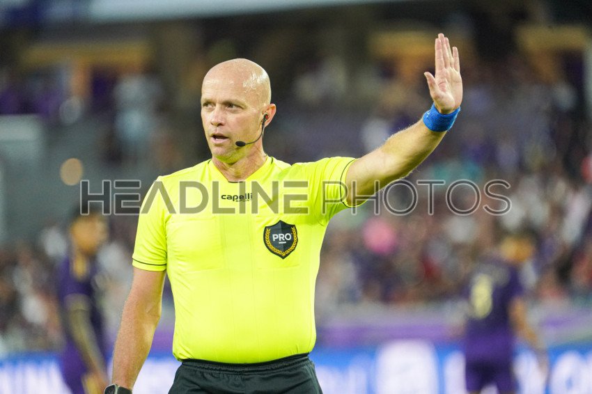 Orlando, Florida, USA, May 27, 2023, Game Ref Allen Chapman gestures during a call for penalty in the first half at Exploria Stadium. (Photo Credit: Marty Jean-Louis)