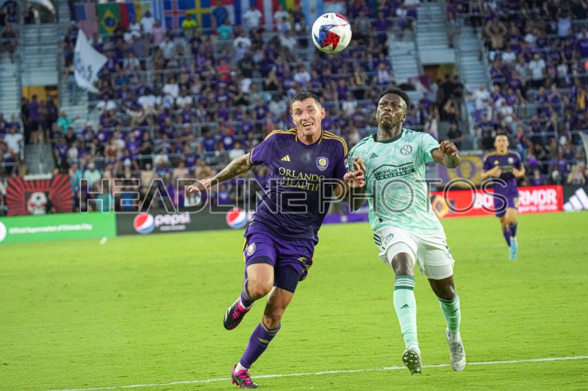 Orlando, Florida, USA, May 27, 2023, Atlanta United player Derreck Etienne #18 and Orlando City SC player Kyle Smith #24 fight for the ball in the first half at Exploria Stadium. (Photo Credit: Marty Jean-Louis)