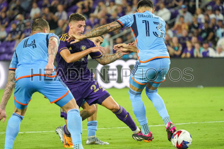 Orlando, Florida, USA, May 17, 2023, Orlando City SC player Gaston Gonzalez #22 attepmt to run pass NYCFC players during the match at Exploria Stadium. (Photo Credit: Marty Jean-Louis)