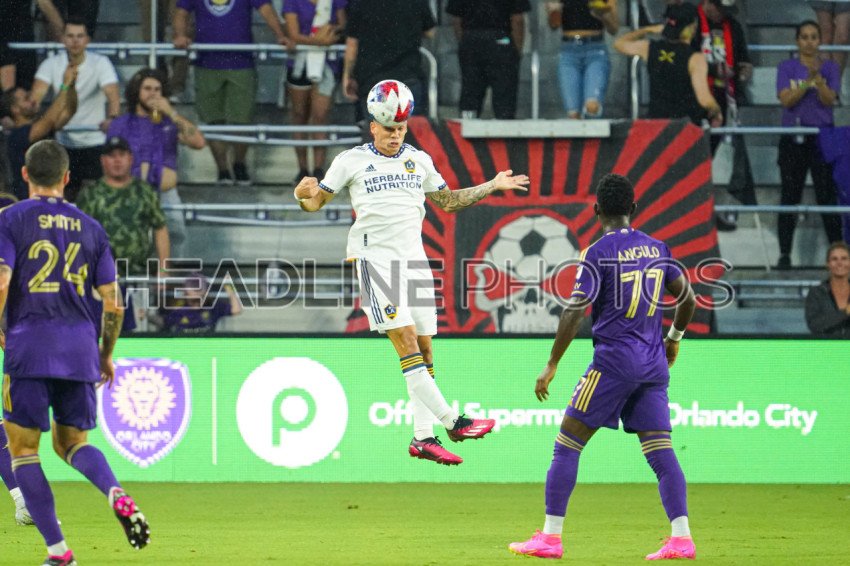 Orlando, Florida, USA, April 29, 2023, LA Galaxy defender Calegari #2 makes a header at Exploria Stadium. (Photo Credit: Marty Jean-Louis)