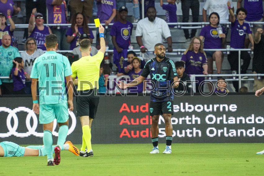Orlando, Florida, USA, April 22, 2023, DC United defender Ruan #2 receives a yellow card in the first half at Exploria Stadium. (Photo Credit: Marty Jean-Louis)