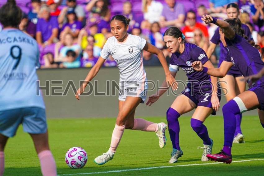 Orlando, Florida, USA, April 2, 2023, Angel City forward Alyssa Thompson #21 controls the ball as she moves up field at Exploria Stadium. (Photo Credit: Marty Jean-Louis)