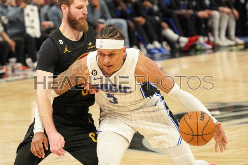 Orlando, Florida, USA, April 4, 2023, Orlando Magic forward Paolo Banchero #5 pushes forward toward the basket in the second half at the Amway Center. (Photo Credit: Marty Jean-Louis)