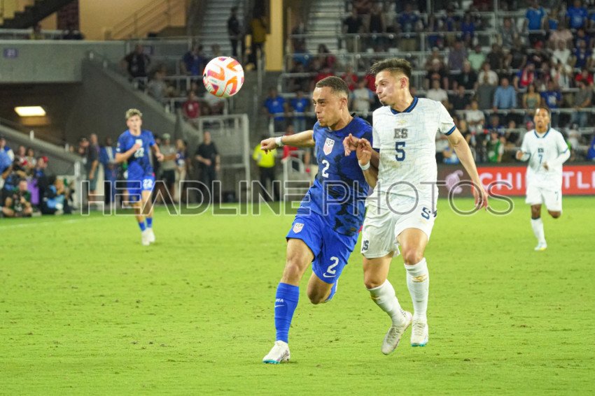 Orlando, Florida, March 27, 2023, El Salvador player Nelson Blanco #5 and USA player Sergino Dest #2 fight for the ball during the CONCACAF Nations League Match at Exploria Stadium. (Photo Credit: Marty Jean-Louis)