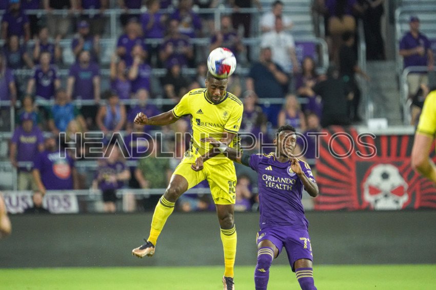 Orlando, Florida, USA, April 1, 2023, Nashville SC player Shaquell Moore #18 makes a header at Exploria Stadium (Photo Credit: Marty Jean-Louis)