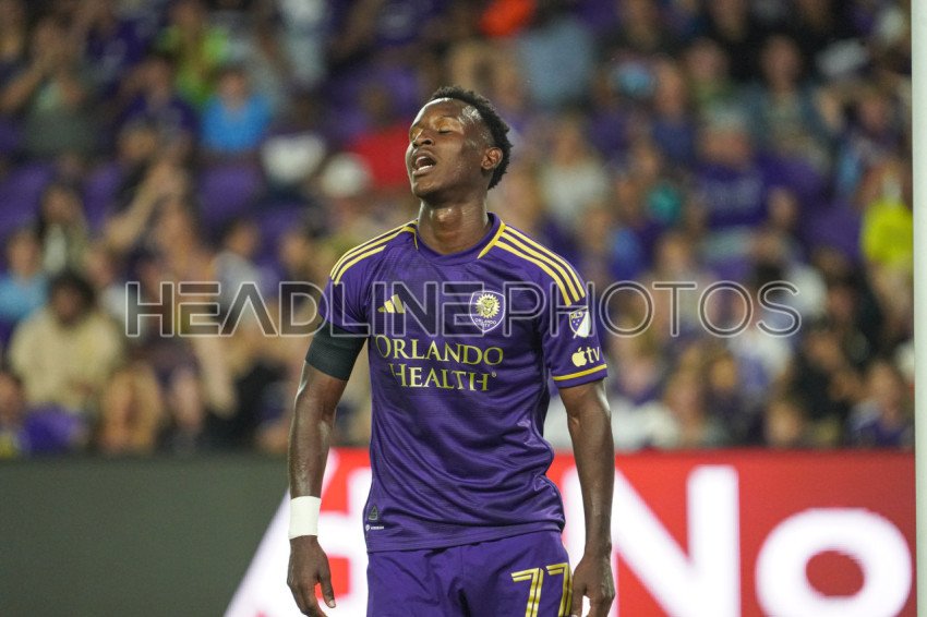 Orlando, Florida, USA, April 1, 2023, Orlando City player Ivan Angulo #77 reacts after missing an opportunity to score in the second half at Exploria Stadium (Photo Credit: Marty Jean-Louis)