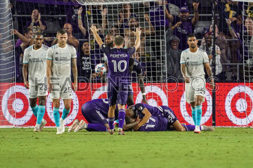 Orlando, Florida, USA, October 24, 2021, Orlando City SC players celebrate goal at Exploria Stadium. (Photo Credit: Marty Jean-Louis)