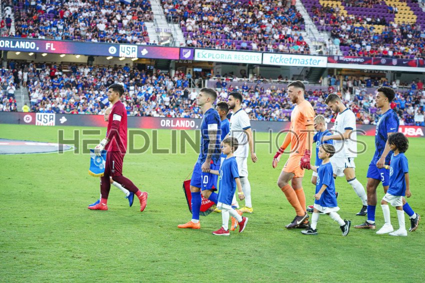 Orlando, Florida, March 27, 2023, El Salvador and USA players entering the pitch during the CONCACAF Nations League Match at Exploria Stadium. (Photo Credit: Marty Jean-Louis)